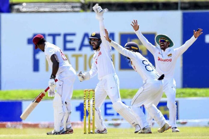 Two-down batter Shai Hope looked nervous and survived some close calls. He played with an outright defensive strategy to survive against host spinners on a rank turner. His partner Roston Chase couldn’t stick on the pitch much and got caught by Pathum Nissanka on 10.